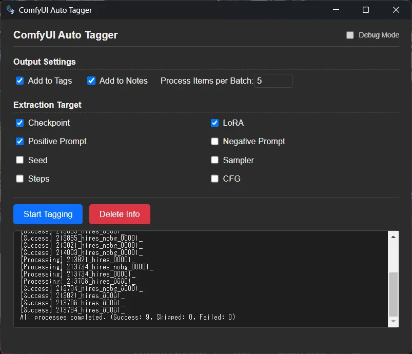 ComfyUI Auto Tagger automatically extracts metadata (Workflow and Prompt JSON) from ComfyUI-generated images and organizes them into Eagle Tags and Notes.